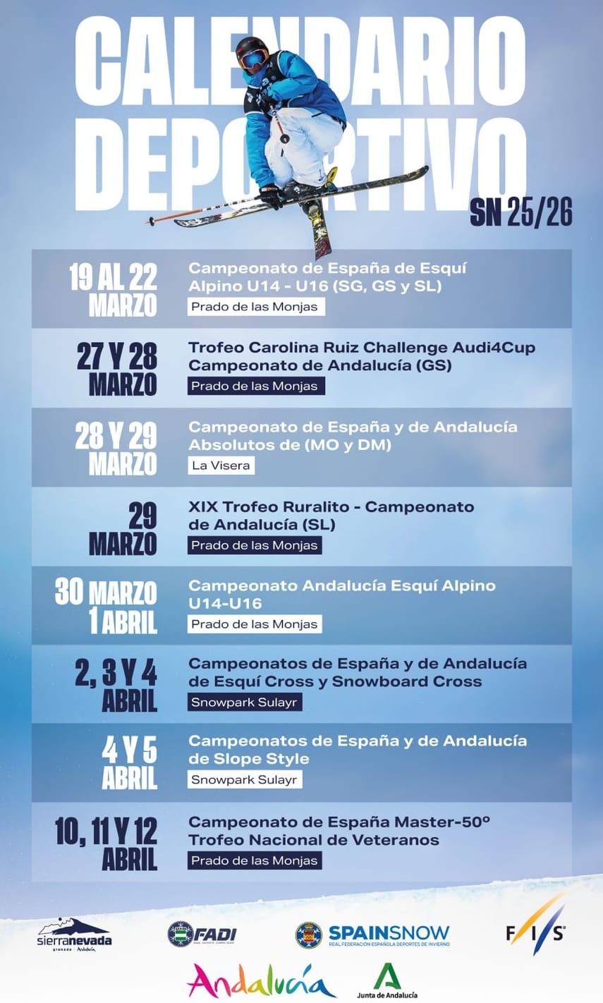 El calendario, que se extiende desde el 19 de marzo hasta 12 de abril, concentrando pruebas de ámbito autonómico y nacional, y abarcando distintas disciplinas y categorías. La programación se inició este pasado 19 con el Campeonato de España de Esquí Alpino U14–U16, en las disciplinas de supergigante, gigante y slalom, celebrado en Prado de las Monjas. Esta primera cita marca el inicio de un bloque competitivo en el que se va a decidir toda la temporada, y que va a verse complementado con charlas que aporten valor añadido para los deportistas y entrenadores, algunas de las cuales, se enmarcan dentro del programa Mentor 10.